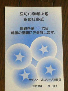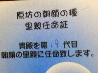原坊を里親とするこの朝顔の里親の系図はその後全国に広がり、いつの頃か“幸せを呼ぶ朝顔”として